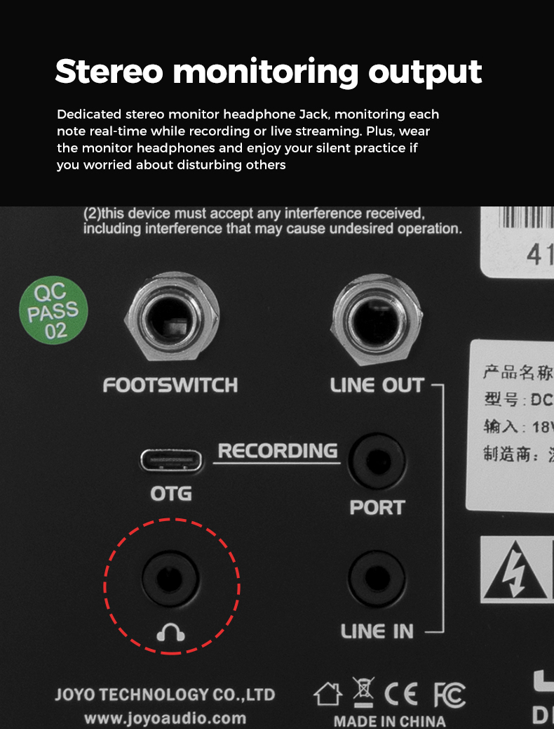Entrada para fones de ouvido estéreo dedicada para monitoração, monitorando cada nota em tempo real durante gravações ou transmissões ao vivo. Além disso, use os fones de ouvido para monitoração e curta sua prática silenciosa se estiver preocupado em incomodar os outros.