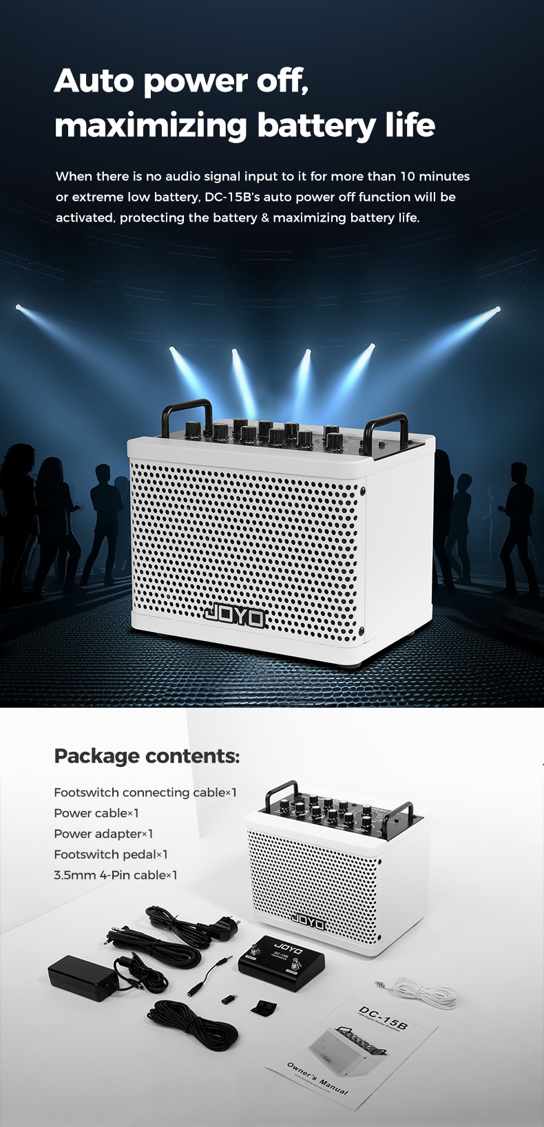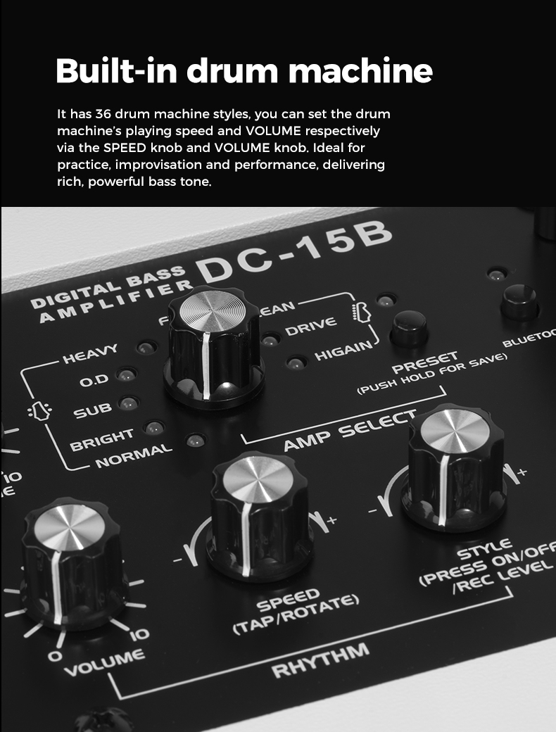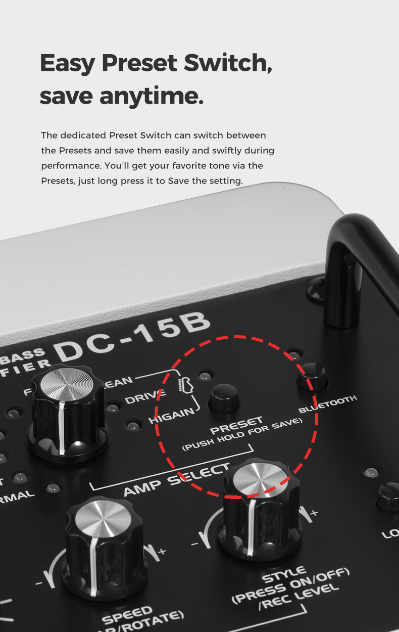 O DC-15B possui 9 modelos de pré-amplificadores profissionais, incluindo 5 modelos clássicos de pré-amplificadores para baixo, 1 modelo para violão acústico ou para quem precisa de resposta plana e 3 modelos de pré-amplificadores para guitarra elétrica. Você pode escolher qualquer gênero com facilidade.
