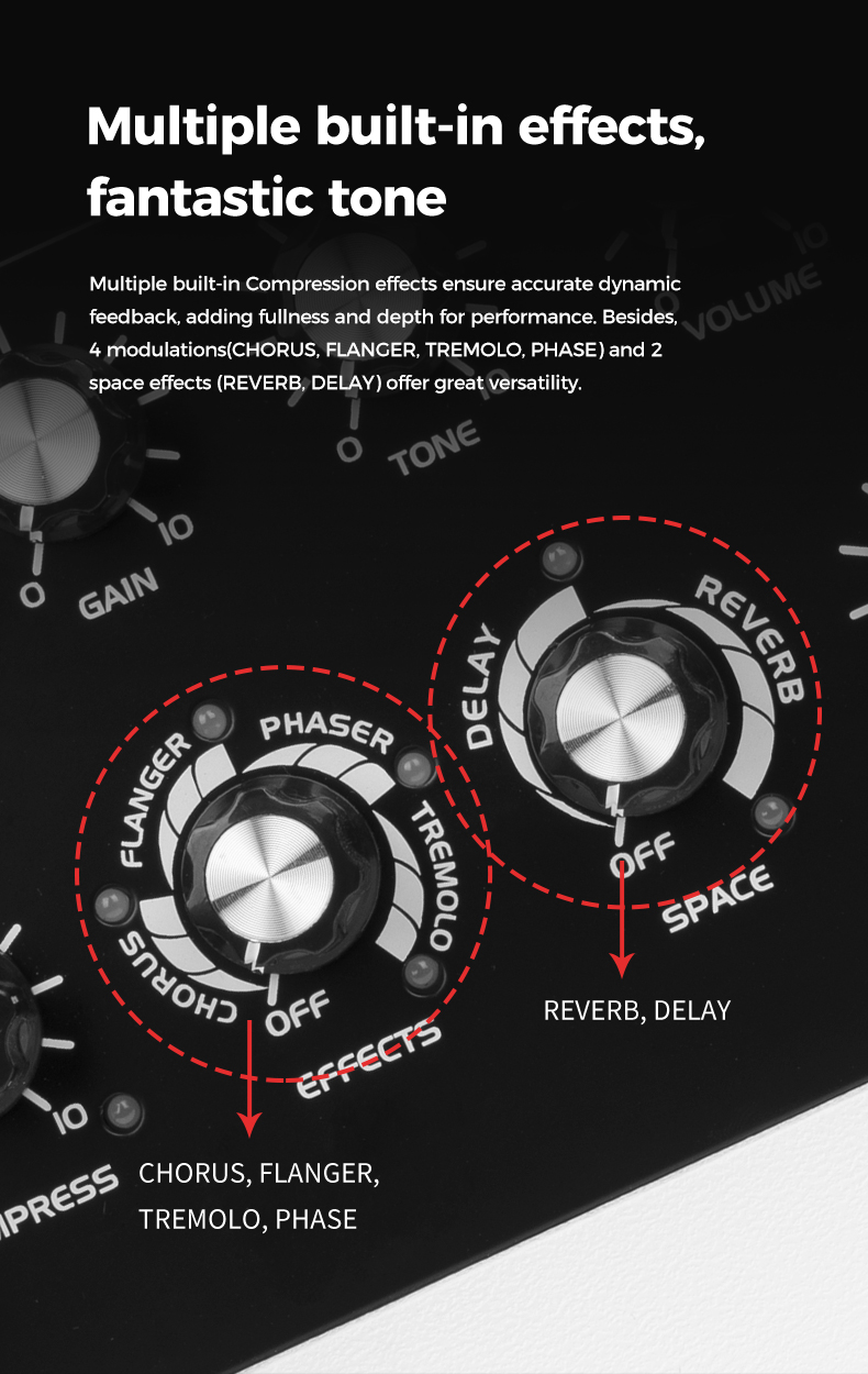 Além disso, 4 modulações (CHORUS, FLANGER, TREMOLO, PHASE) e 2 efeitos espaciais (REVERB, DELAY) oferecem versatilidade.