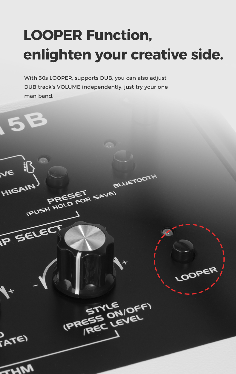 Com 30 segundos de LOOPER, suporta DUB, você também pode ajustar o VOLUME da faixa DUB de forma independente, basta experimentar "sua banda solo".