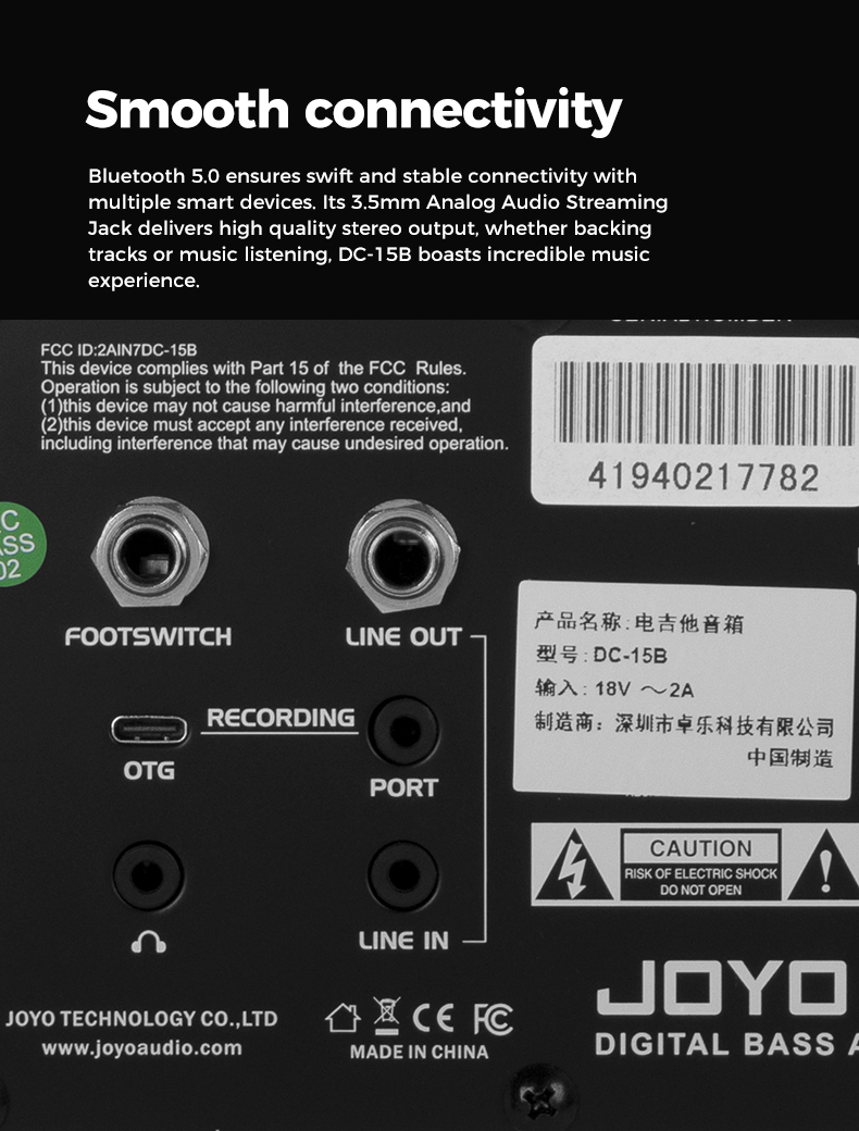 O Bluetooth 5.0 garante conectividade rápida e estável com vários dispositivos inteligentes. Seu conector analógico de 3,5 mm para streaming de áudio oferece saída estéreo de alta qualidade, seja para ouvir faixas de acompanhamento ou música.