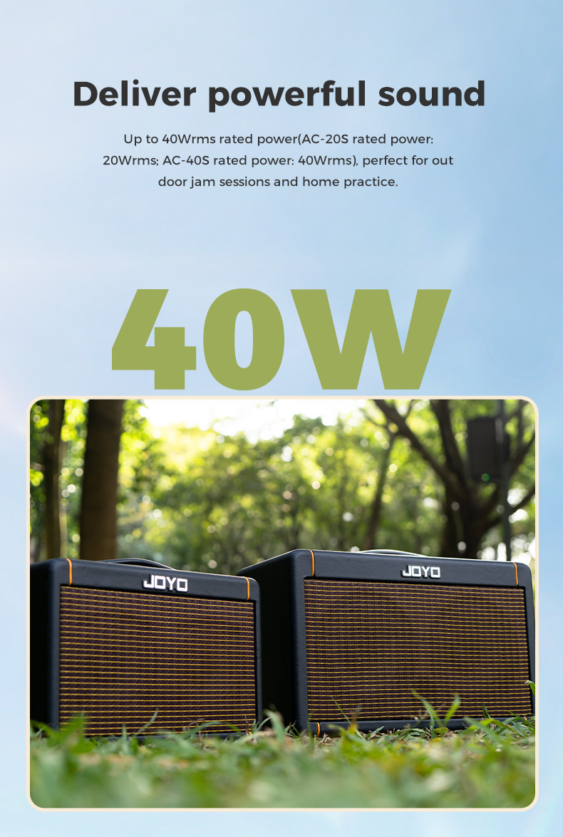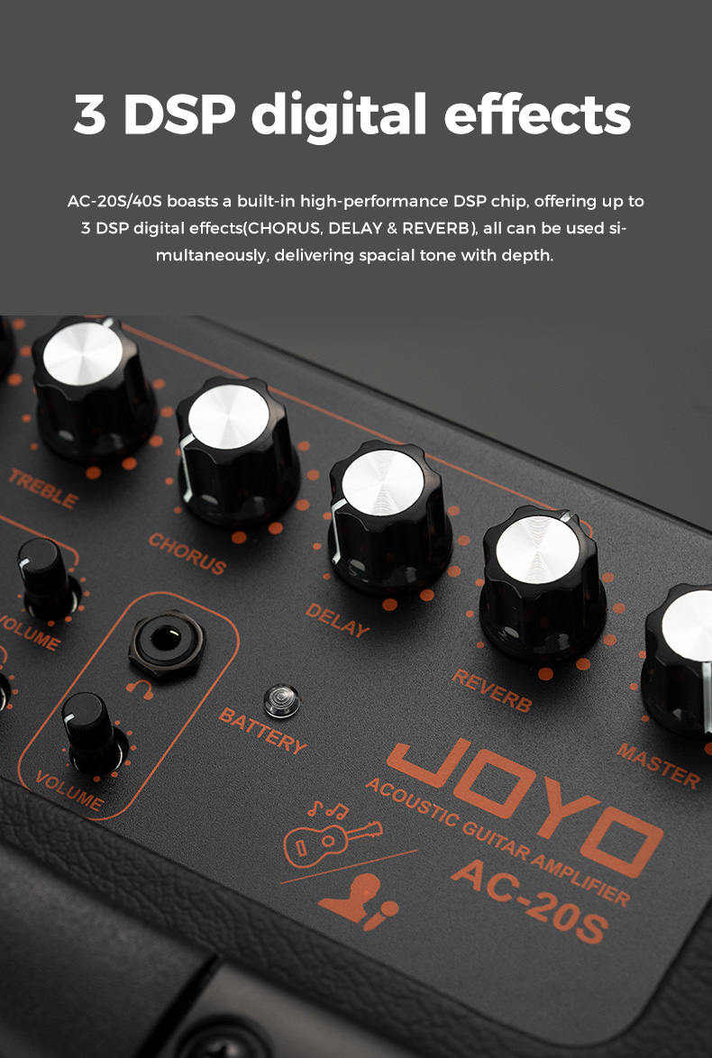O AC-20S/40S possui um chip DSP de alto desempenho integrado, oferecendo até 3 efeitos digitais DSP (CHORUS, DELAY e REVERB), todos podem ser usados simultaneamente, proporcionando um tom espacial com profundidade.