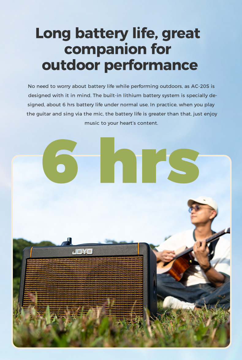Não precisa se preocupar com a duração da bateria ao tocar ao ar livre, pois o AC-20S foi projetado pensando nisso. O sistema de bateria de lítio integrado foi especialmente projetado para durar cerca de 6 horas em uso normal. Na prática, ao tocar violão e cantar pelo microfone, a duração da bateria é ainda maior. Aproveite!