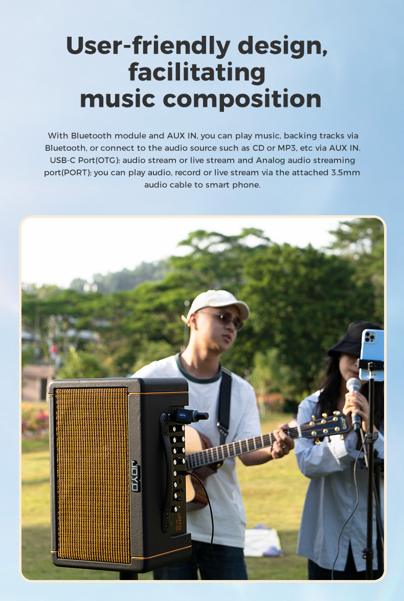 Com o módulo Bluetooth e AUX IN, você pode reproduzir música, faixas de apoio via Bluetooth ou conectar-se à fonte de áudio, como CD ou MP3, etc. via AUX IN. Porta USB-C (OTG): transmissão de áudio ou transmissão ao vivo e porta de transmissão de áudio analógica (PORT): você pode reproduzir áudio, gravar ou transmitir ao vivo por meio do cabo de 3,5 mm conectado.