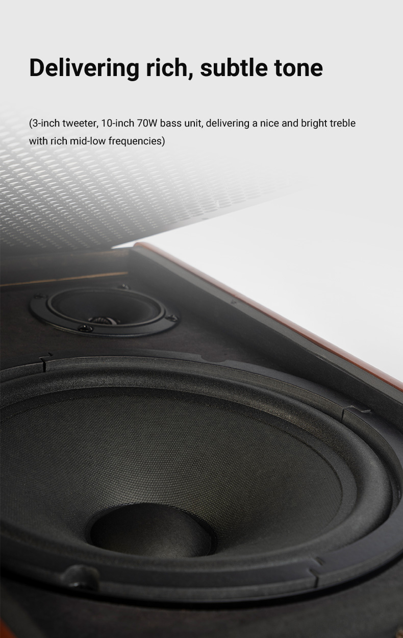 Tweeter de 3 polegadas, grace de 10 polegadas e 70W, proporcionando agudos agradáveis e brilhantes com frequencias médias e baixas ricas.
