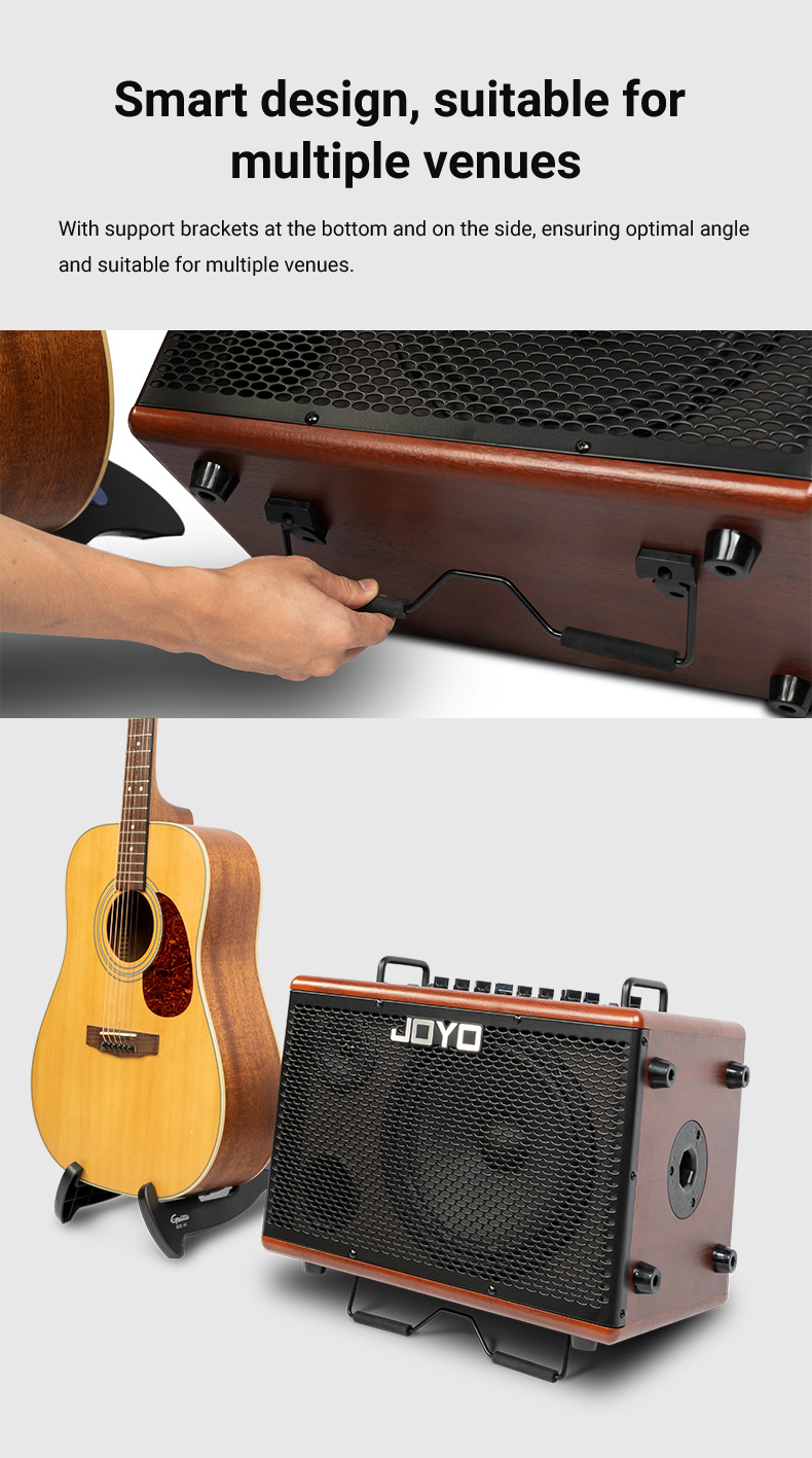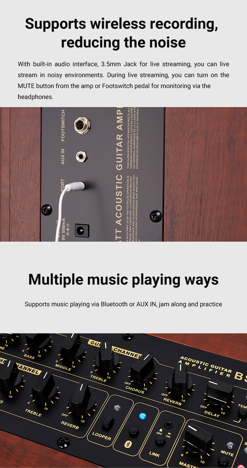 Com interface de áudio integrada e conector de 3,5 mm para transmissão ao vivo, você pode transmitir ao vivo em ambientes barulhentos. Durante a transmissão ao vivo, você pode ativar o botão MUTE do amplificador ou o pedal Footswitch para monitorar através dos fones de ouvido.