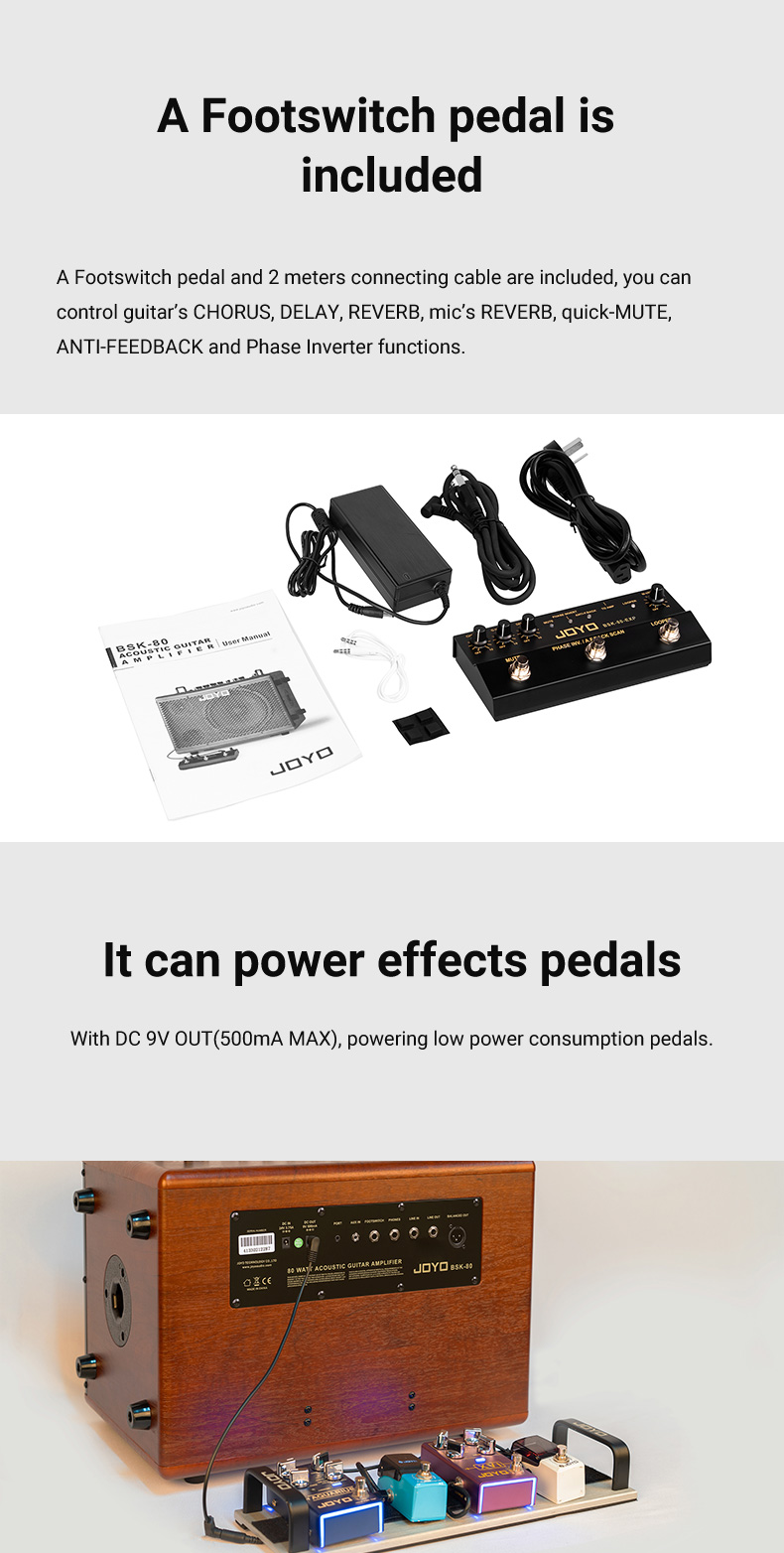 Com saída DV 9V centro-negativo (500mA soma máxima), alimentando pedais de baixo consumo de energia, como um Overdrive, por exemplo.