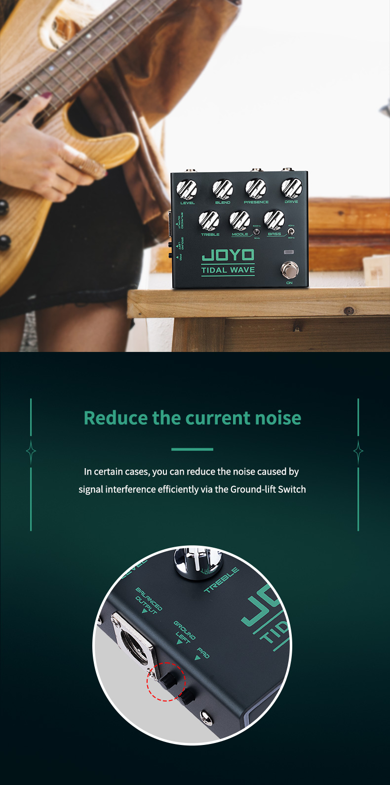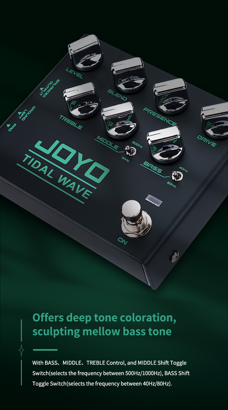 Para reduzir o ruído, basta ativar o botão Ground Left e usar a fonte de alimentação do pedal JOYO 9V DC. Esses recursos garantem um timbre de baixo limpo e claro, permitindo que você se concentre na sua performance sem distrações. Eleve seu baixo com o pedal overdrive JOYO R-30 Tidal Wave Preamp.