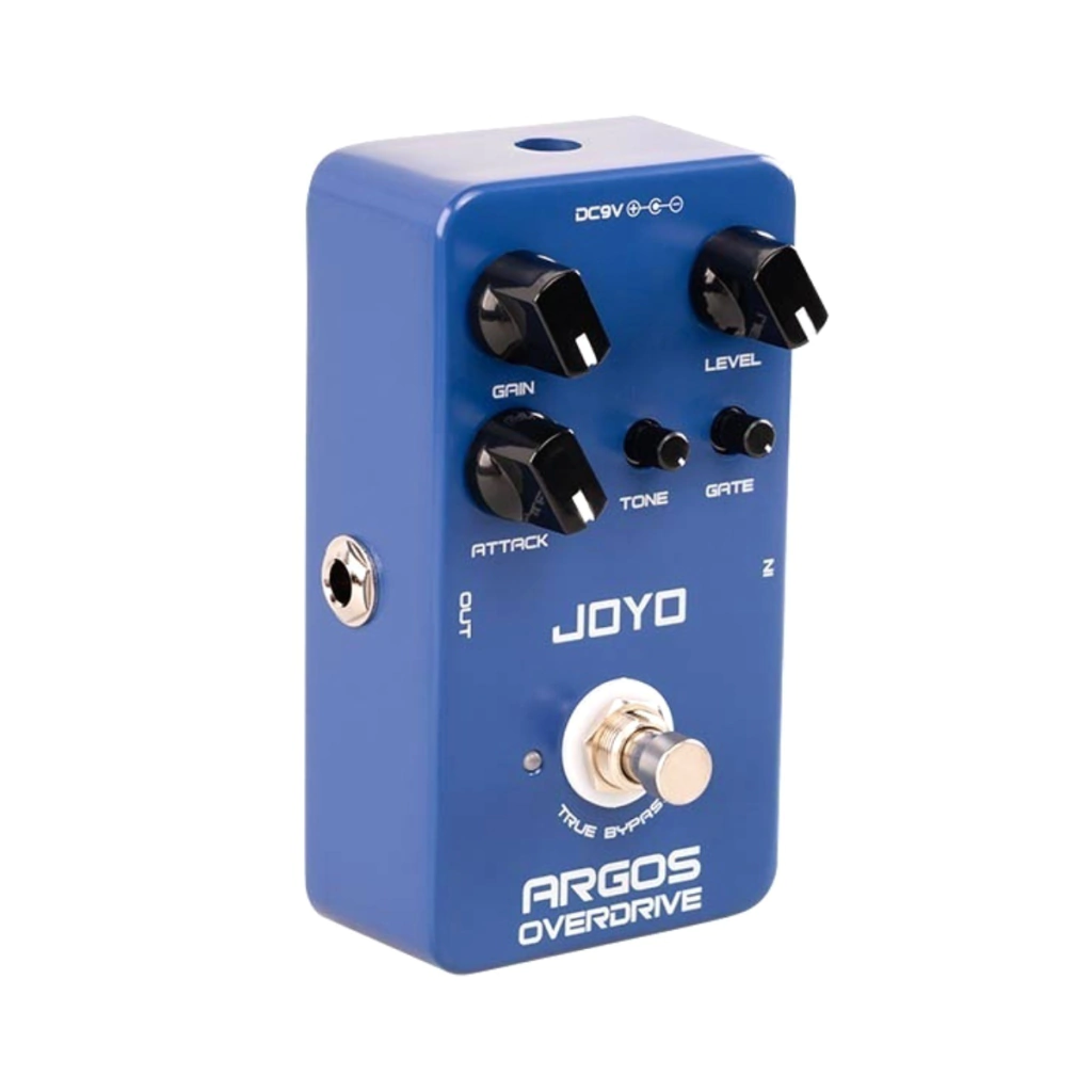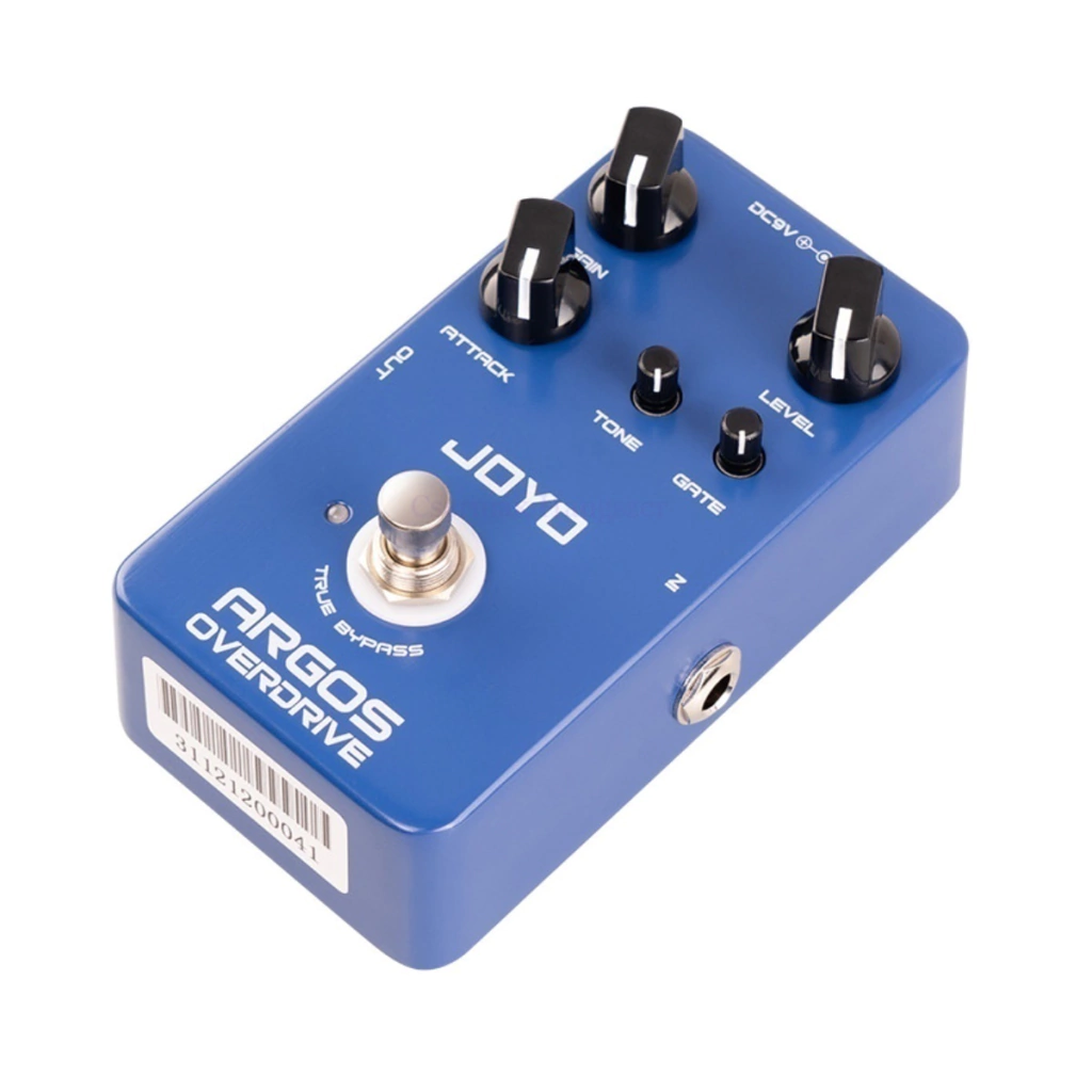 JOYO ARGOS Overdrive, uma unidade versátil e inovadora que combina sons clássicos de overdrive com um circuito integrado de limiar de ruído ajustável, em uma caixa de alumínio elegante azul cobalto. Pesando apenas 330 gramas e medindo um tamanho compacto de 12 cm x 7,6 cm x 5,5 cm, este pedal foi projetado para portabilidade sem sacrificar a funcionalidade.