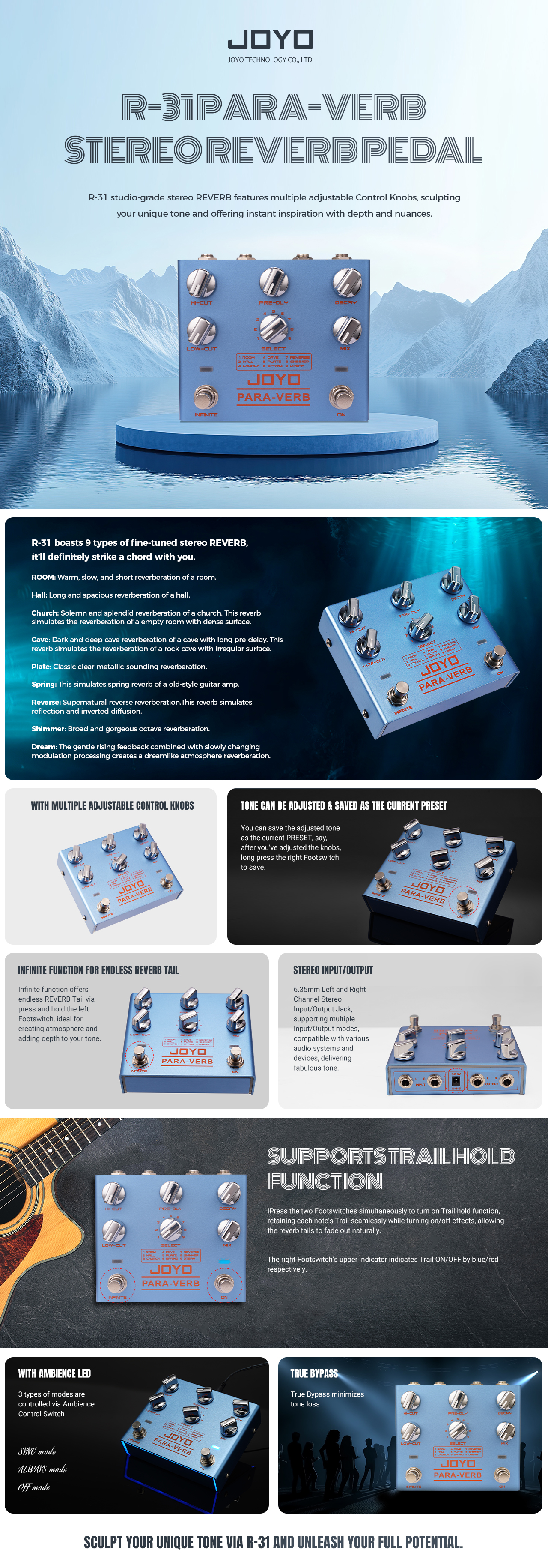 O JOYO R-31 PARA-VERB é um pedal de reverb estéreo com nível de estúdio, projetado para inspirar e aprimorar seu som com profundidade e nuances. Com 9 efeitos de reverb afinados, este pedal permite que você ajuste seu timbre único com vários botões de controle ajustáveis.